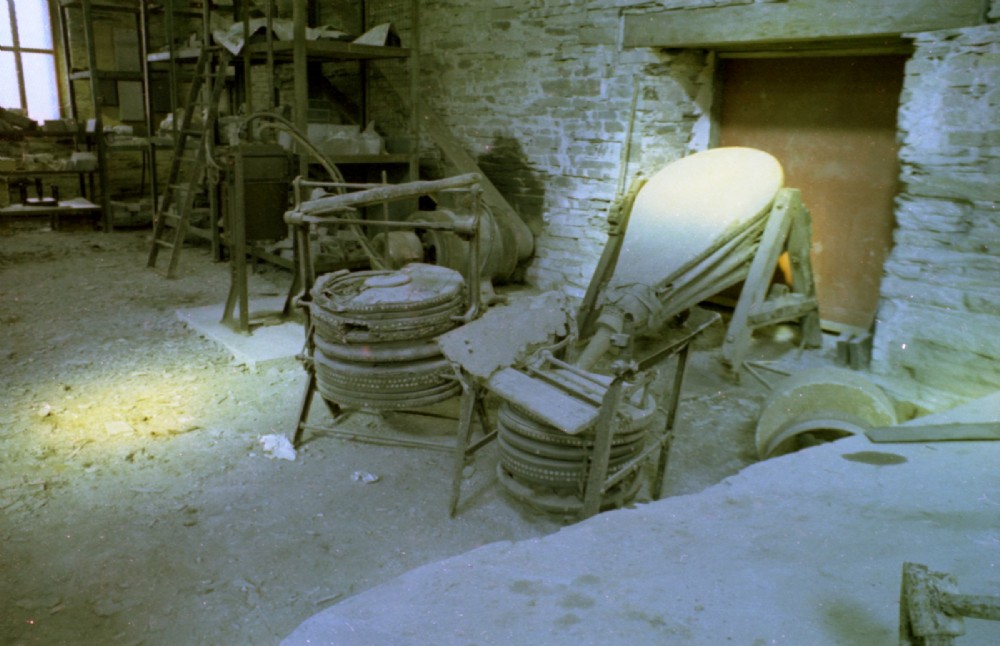 A variety of old bellows, behind them is the motor which drove the line shafting.