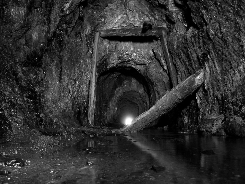Looking to daylight down the main adit and past a short timbered section, Benallt copper mine, Nantlle valley.