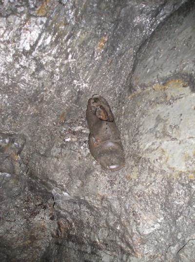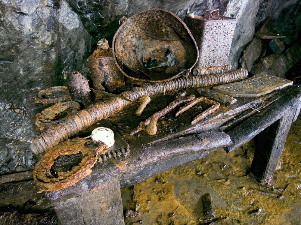 A bench containing various artifacts and tools, deep adit level, Bwlchglas Lead Mine.