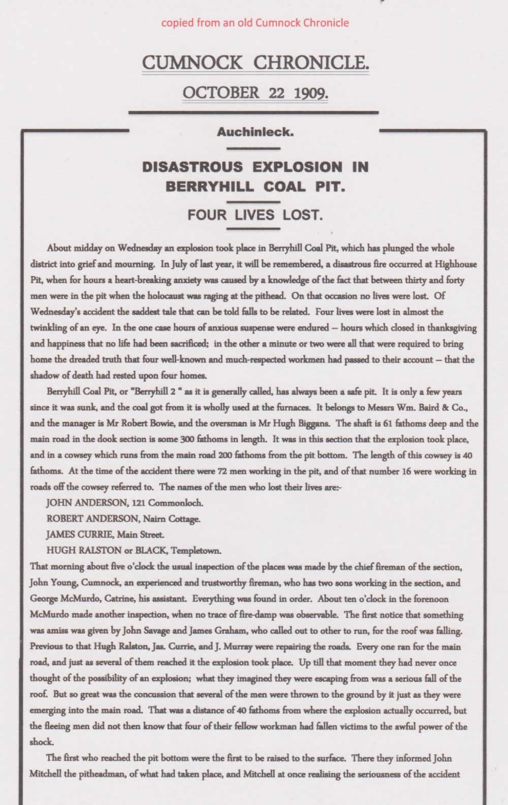 Copy of local newspaper report on the Berryhill No.2 explosion - part 1.