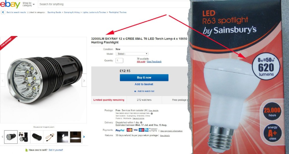 The bulb on the right sold by a highly reputable UK retailer carries a correct description of its output. The eBay torch on the left carries a fake claim for its output. On only has to look at the output of the bulb to get an idea what lumens are all about and form ones own judgement.