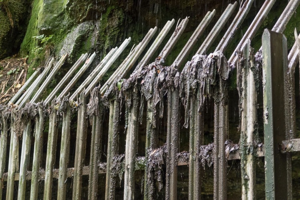Sewage pours down the cliff face from the house above and runs straight into the mine, turning it into a giant septic tank. You can see the sanitary products trapped on the spikey fence blocking the adit.