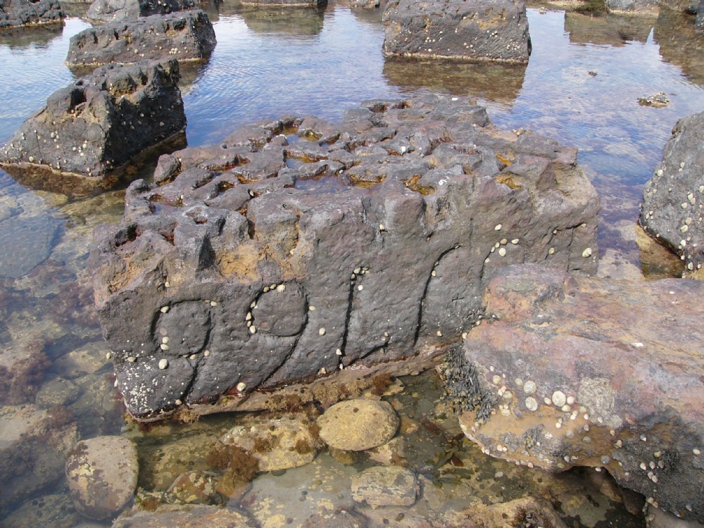 Upside down datestone which lies behind the breakwater.
