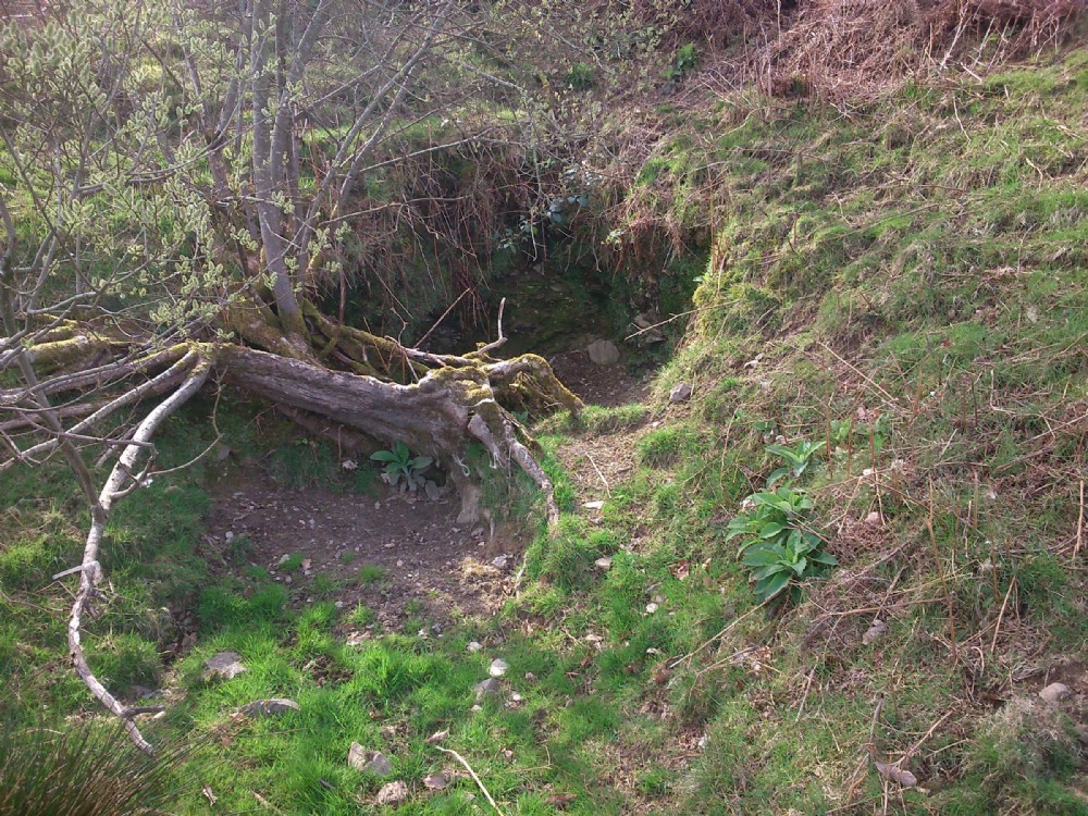 The blocked adit above the main shaft. There is a small spoil heap in front so this may be a trial level.