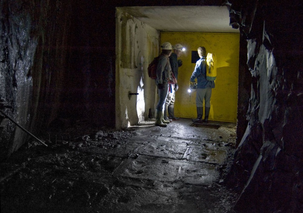 Tramway into bomb store closed by large yellow steel plate (fitted July 2011?).