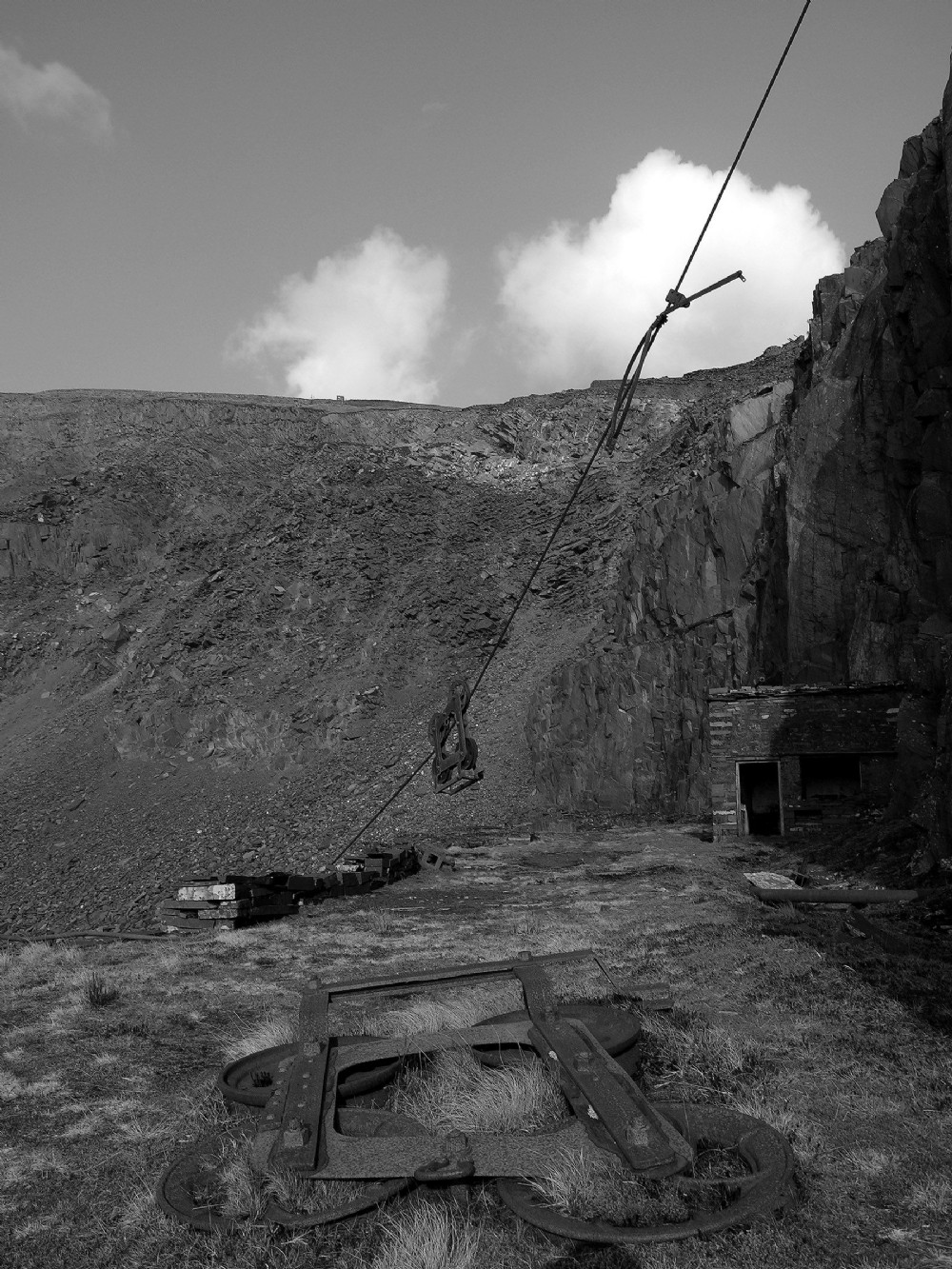 The Blondin trolley suspended from the cable is firmly rusted in place; and a second lies rusting in the forground.