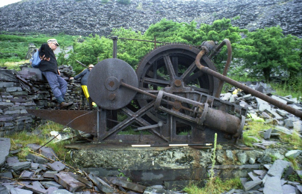 Here, it's temporary shelter long gone, is the cableway engine. A Henderson steam driven variety, still with its cylinders and most of its valvegear etc. in place - brasswork long gone of course.