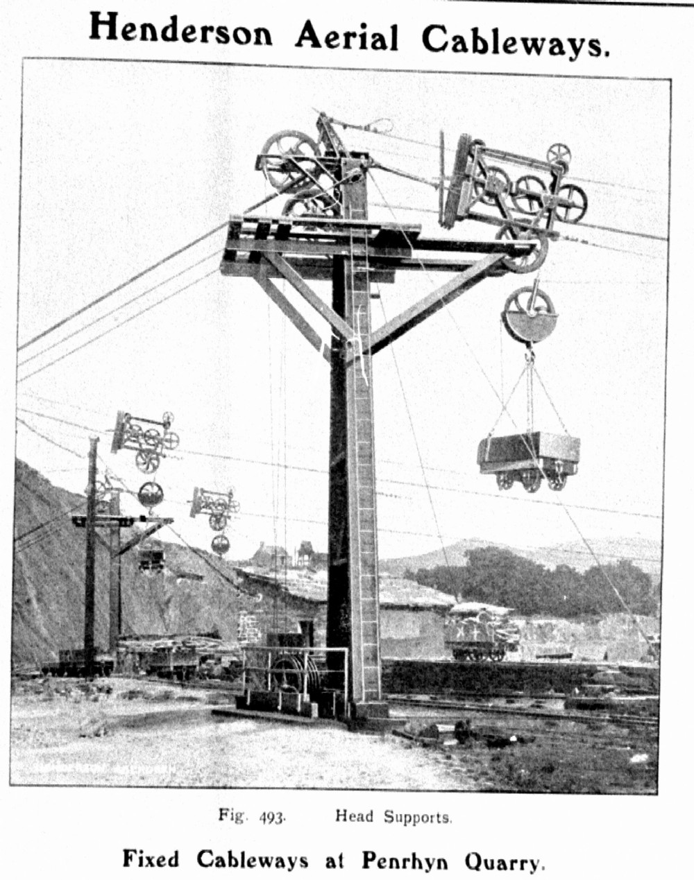 this shows the main masts with the pulleys at the foot redirecting the traversing rope and hoisting rope through a right angle towards the motor house behind the photographer.