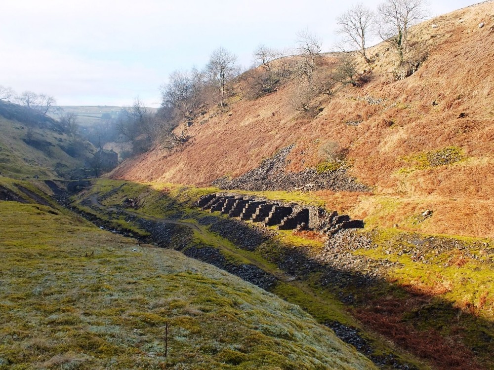 View looking at the bouse teems with the various levels and tramway. Further to the left can be seen the bridge and beyond that is the mine shop and level.