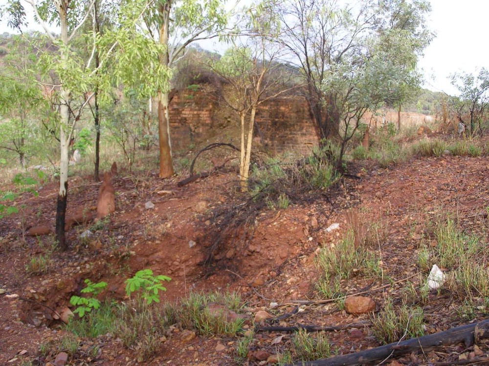 Subsiding shaft in rehabilitated mining area with brick footings immediately behind. Is this a winder foundation or a stack base ?