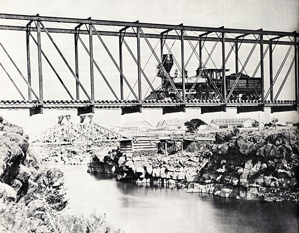 Utah & Northern Bridge at Eagle Rock (Idaho Falls), Idaho circa 1880 with railroad shops in background.
