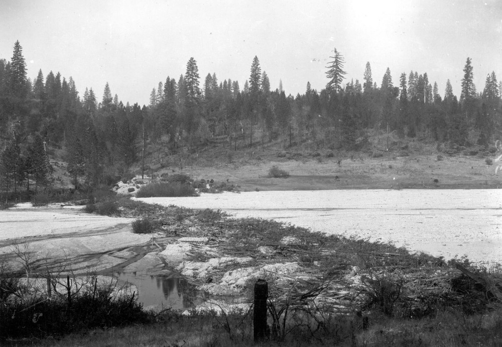 Brush dam on Spring Creek, built to restrain tailings from North Columbia hydraulic mines. Nevada County, California. 1905.