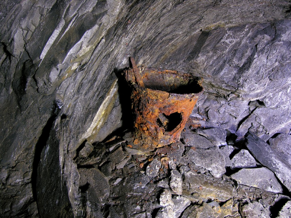 A rusted bucket, well preserved given the age and time spent underwater, on floor C, Cwmorthin back vein.