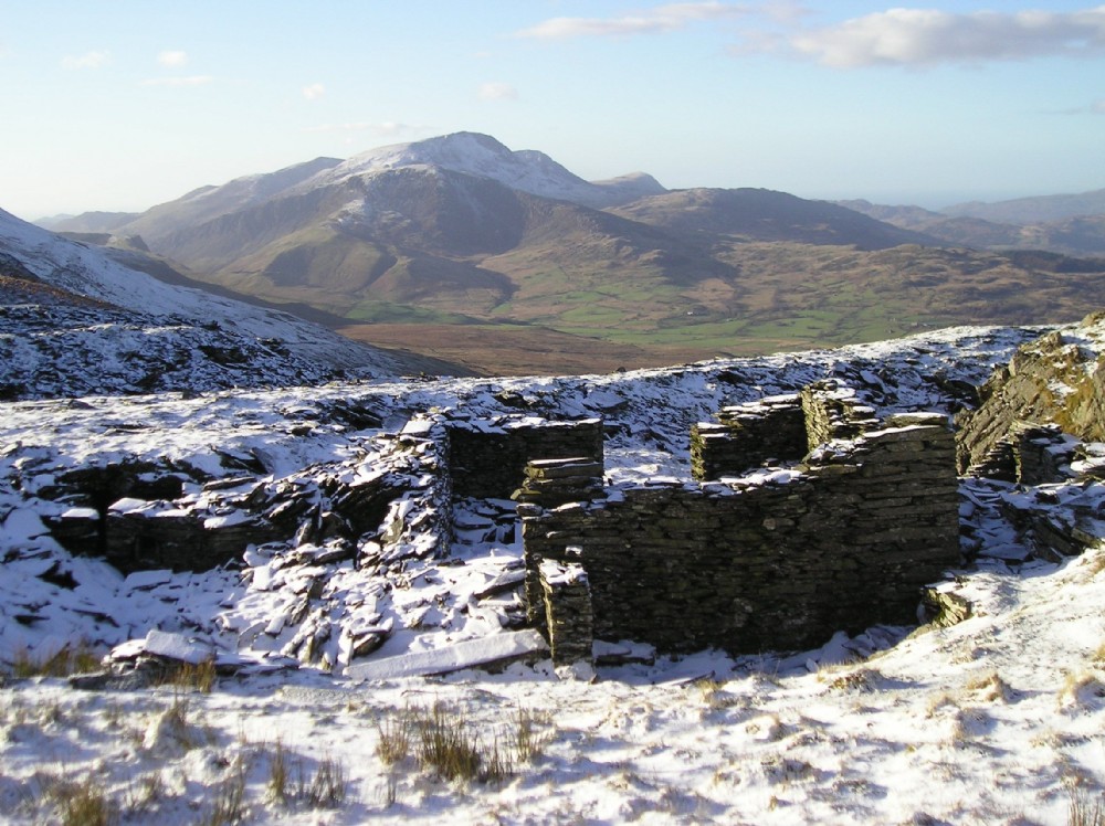 Spoil run and building north of ridge. Cader Idris (Mynydd Moel) in distance.