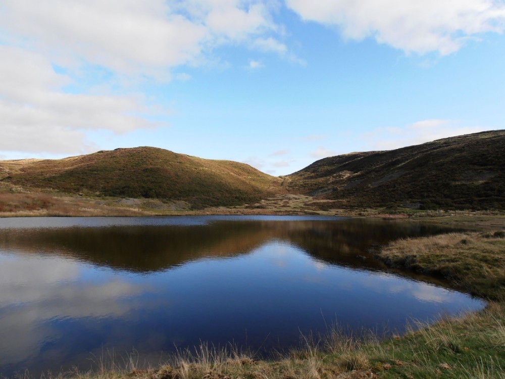 A panaramic view across the lake towards some of the scattered tips of Llwynteifi mine - on top of each a blocked or fenced shaft.