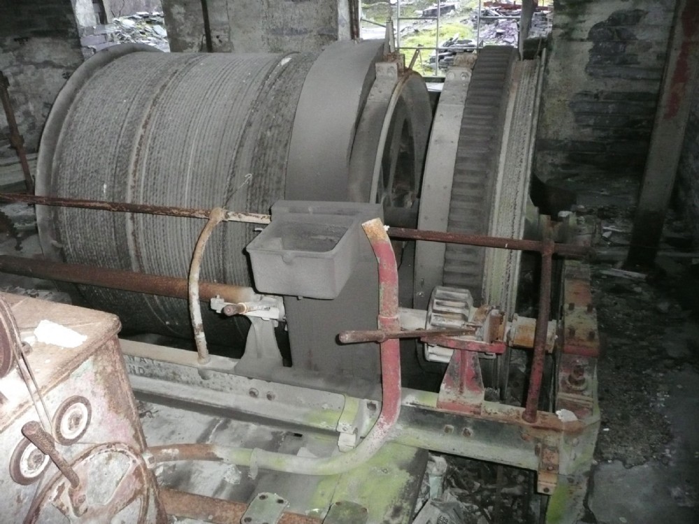 Winding drum viewed from operators platform. Note driveshaft in fro t of the drum with dog-clutch and lever adjacent to the final drive to the winch drum.