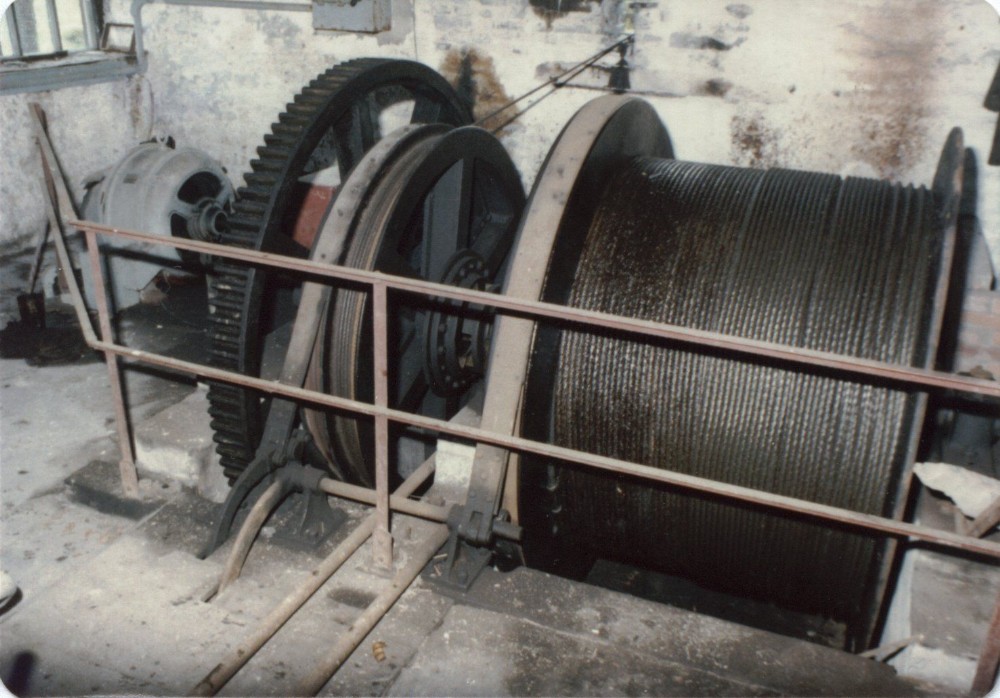 From left to right: 1908 vintage AC motor, traversing cable drum brake, traversing cable drum, clutch space, hoisting drum brake, hoisting drum.