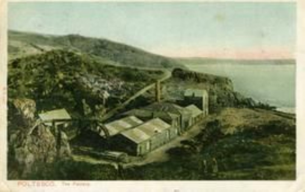 The remains of the Poltesco Serpentine Company's presence in Carleon Cove, probably just at the time of closure in 1893. The chimney stack draughted a small steam engine used for cutting the stone, whilst the waterwheel was used for less strenuous activities.