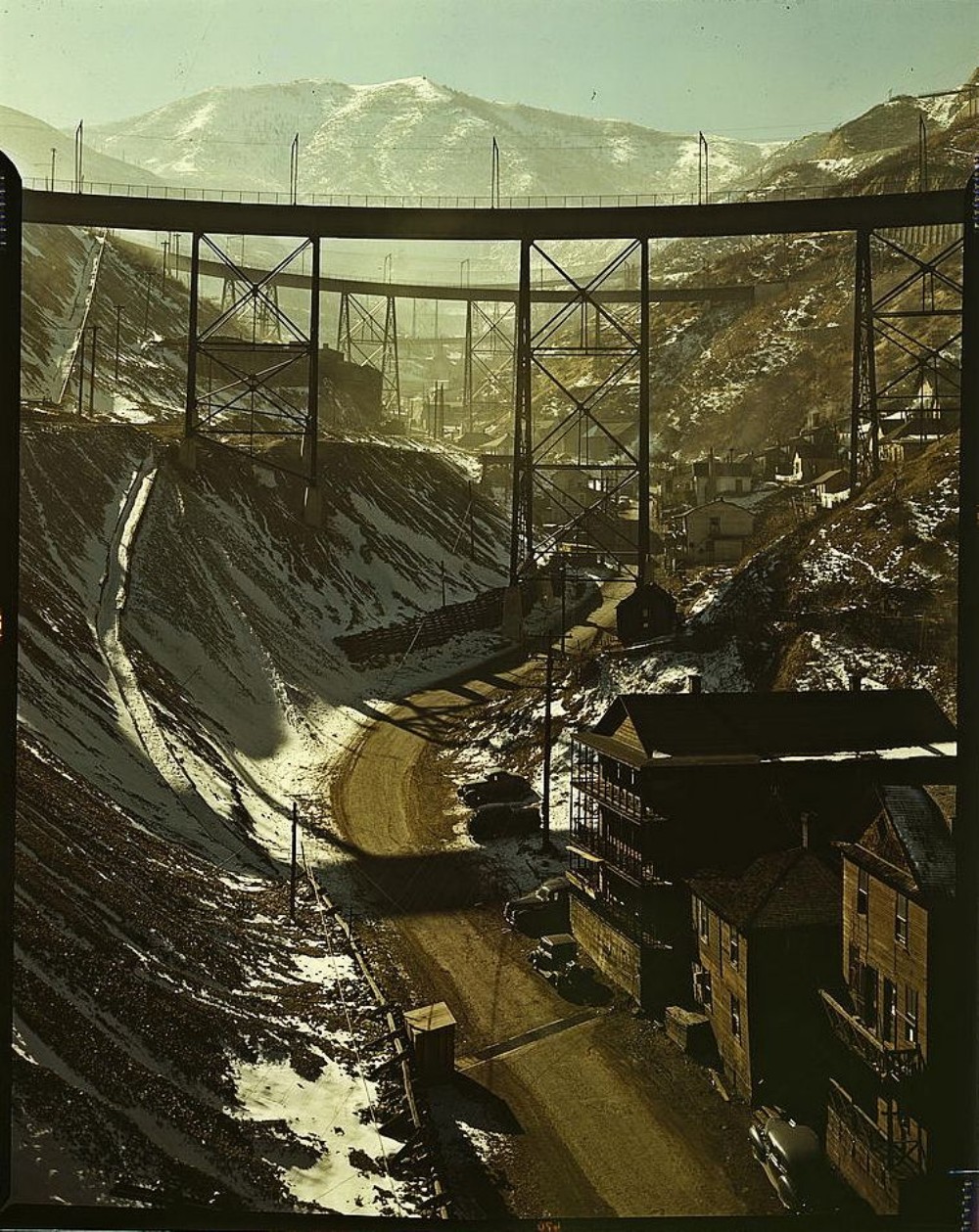 Carr Fork Canyon as seen from "G" bridge, Bingham Copper Mine, Utah. In the background can be seen a train with waste or over-burden material on its way to the dump