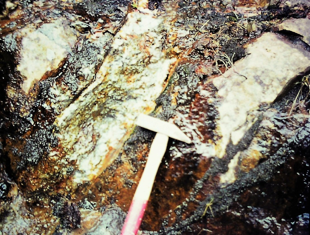 A much clearer photograph of the mispickel vein, a little bit of enhancing to improve the colour( the vein now has a clearer green hue) and removing a little of the bleaching.
