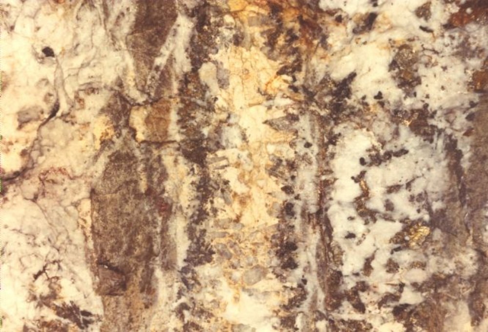 Photo showing the different phases of mineralization within the Harding Vein. Quartz-wolframite-sulphide vein on right, open-space filling of quartz-ankerite in centre, greisenized granite next to the left then barren quartz (with minor scheelite) on the left. 12m south of forehead in June 1972 on the Harding No. 1 North