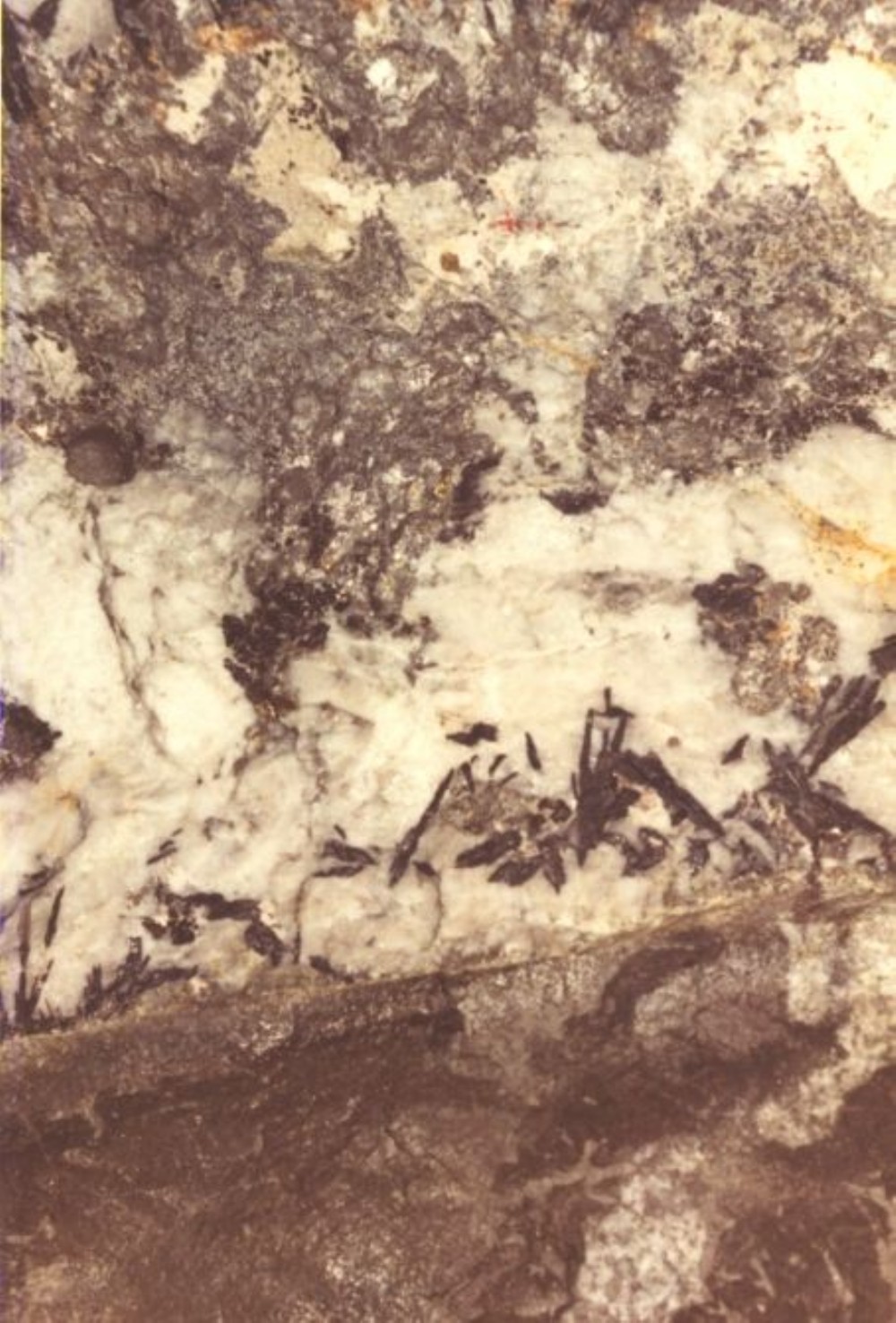 Harding Vein showing good wolframite blades and masses of arsenopyrite.