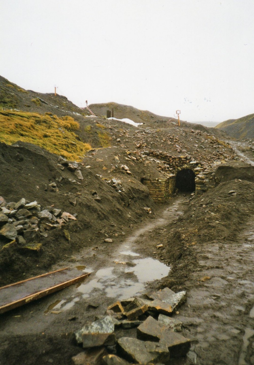 The level mouth in 1998 being restored by the Heritage Trust, the bits of tin sheeting on the hill behind are where a collapse in the arching had run to surface.