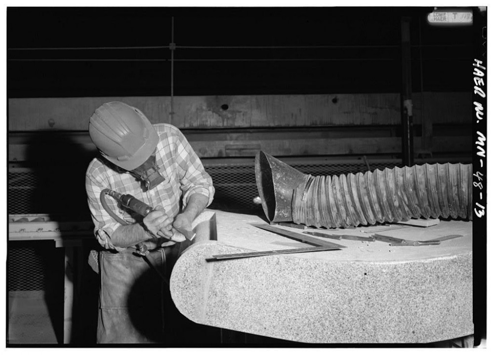 INTERIOR VIEW, STONE CARVER CHISELING A ON GRAVE STONE