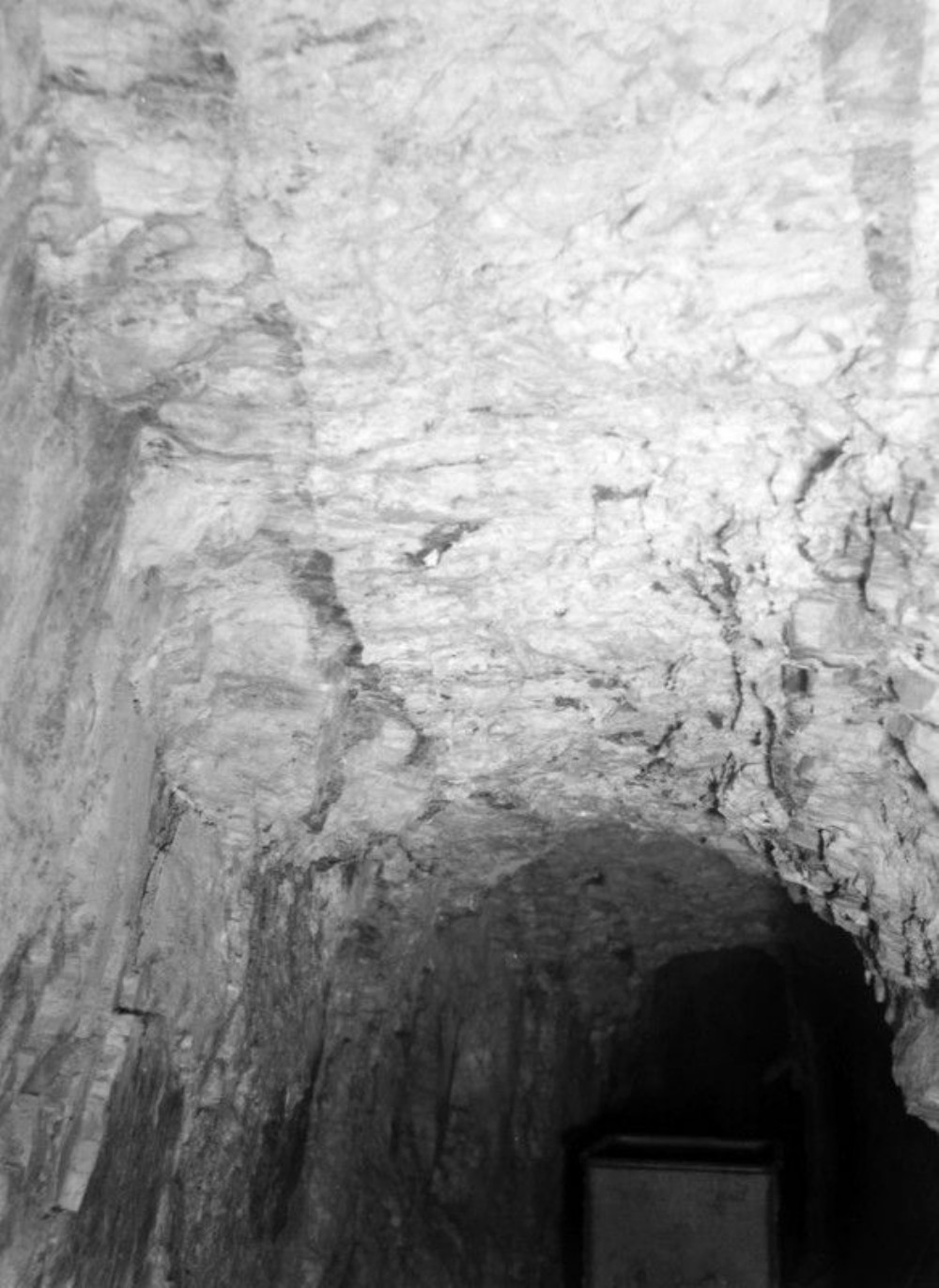 Castle an Dinas. Castle an Dinas Wolfram Mine. The 5th Level, north of New Shaft. The lode, 3 ft. wide, is seen in the roof of the level; occasional black wolfram crystals occur here and there. The sides of the level are of tourmalinized killas wall rock.