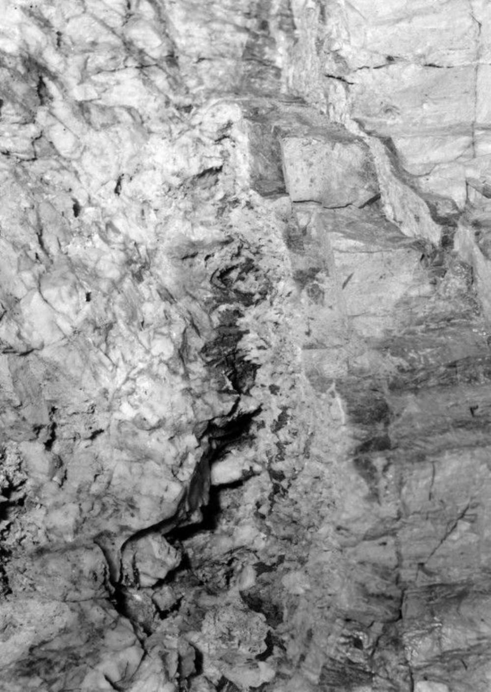 Castle an Dinas. Castle an Dinas Wolfram Mine. The lode, exposed in the back of the 5th Level, north of New Shaft. The edge of the lode runs down the centre of the picture. To the left is the lode consisting of white quartz, with vughs here and there and wolfram crystals (showing black) near the margin. To the right is tourmalinized killas wall rock.