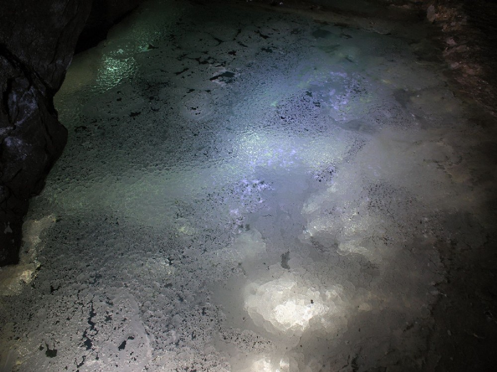In one of the smaller flooded "pipe shafts" the calcite levels have reached such a concentration that a very thin film of calcite has formed (seeded) on the surface of the copper stained water. I've tried to light this from below.