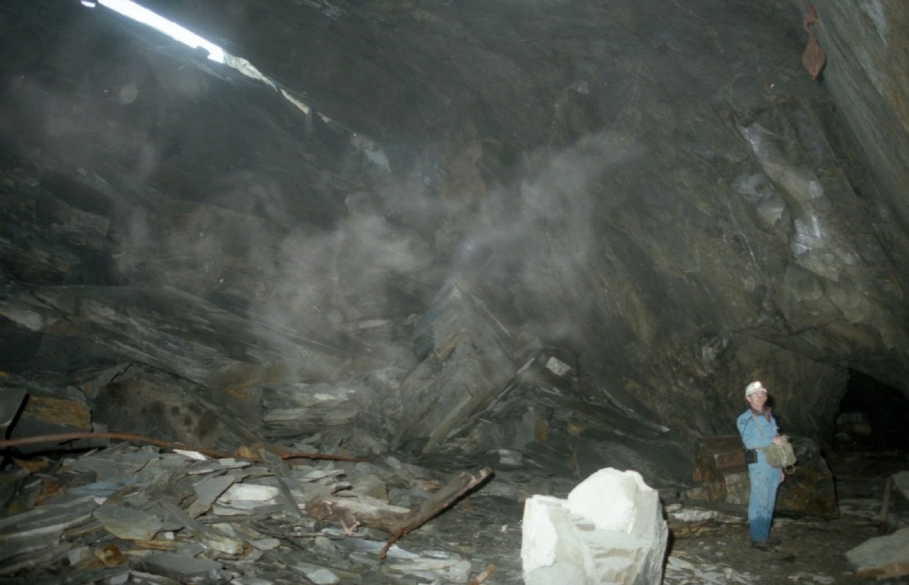 A view looking up to daylight in the next westmost chamber. Due to the numbering this is also chamber B7 ! The number painted on the rock above Will's head refers to the wall and therefore the number of the next chamber. Note the pulley block suspended from the roof instead of using a tripod crane!