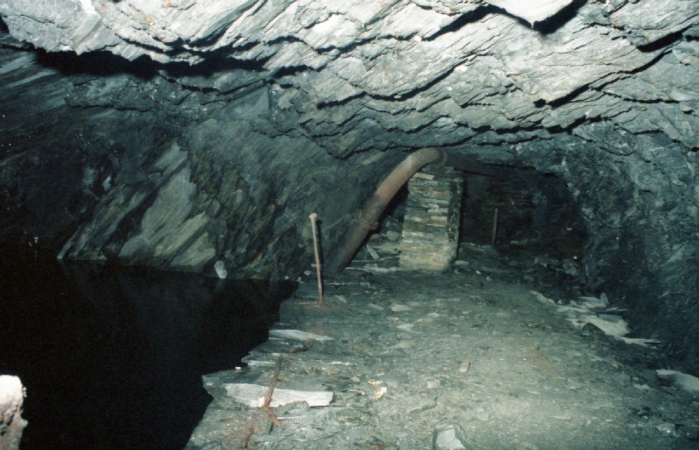 A view looking east in the top of the chamber. The tramway is built up here on a massive slab retaining wall, the edge of which is just visible. The chamber is an odd shape below G floor due to the geology and bends through about 20 degress at H floor before descending again to I floor. From here the pipe descended a purposely sunk shaft into the top of chamber B1 at about the height of K floor before decending to the actual pump on L floor.