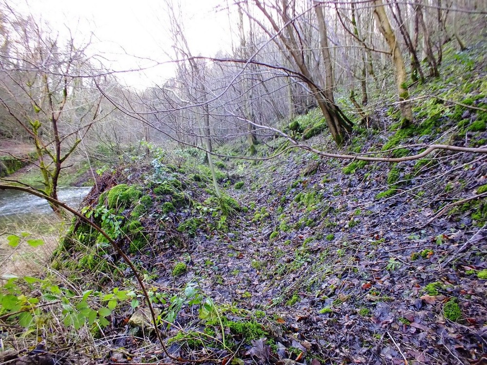 View looking upstream of the flour mill pond (to the left) showing this channel heading to the mouth of the sough