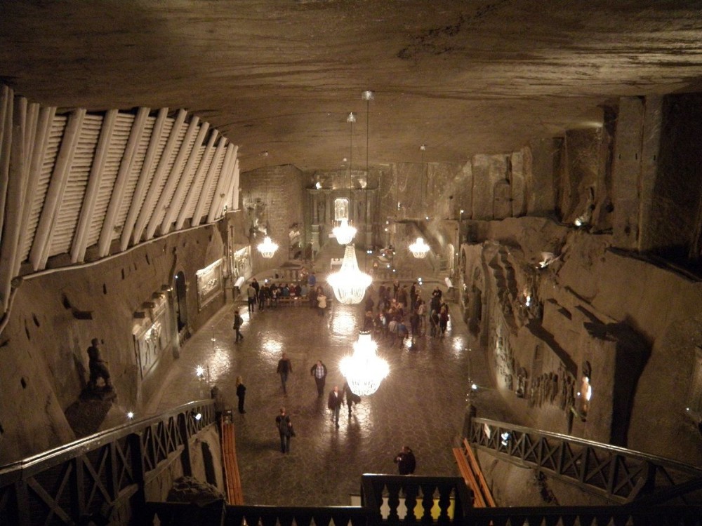 The most impressive and richest of all the underground chambers. 54 metres long, 15 to 18 metres wide and 10 - 12 metres high. The chandelier crystals are made of recrystallised salt from pumped brine.