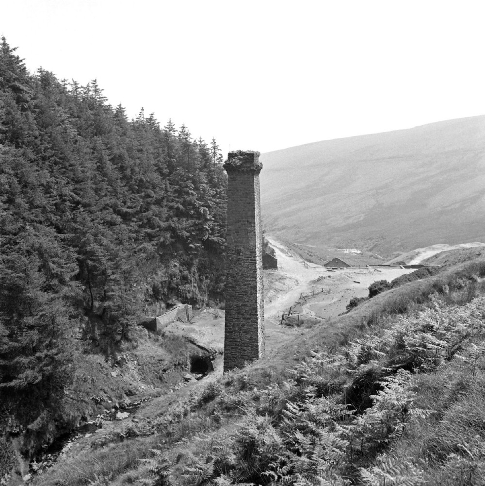 This mine was the scene of a bad mining tragedy in 1897. The main shaft, is located within the walled enclosure to the left of the stack, while the streamway is conducted under the site by means of the tunnel visible in the middle distance.