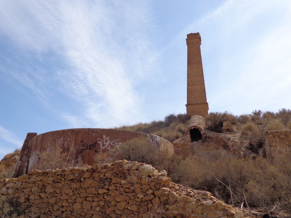 The chimney on top of the hill behind the mine buildings, together with a truncated section of flue