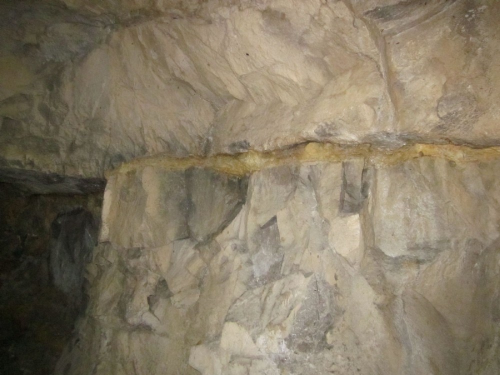 A yellow clay band exposed for some distance along the top of the main passage in the fluorspar section of the mine (the left hand passage)
