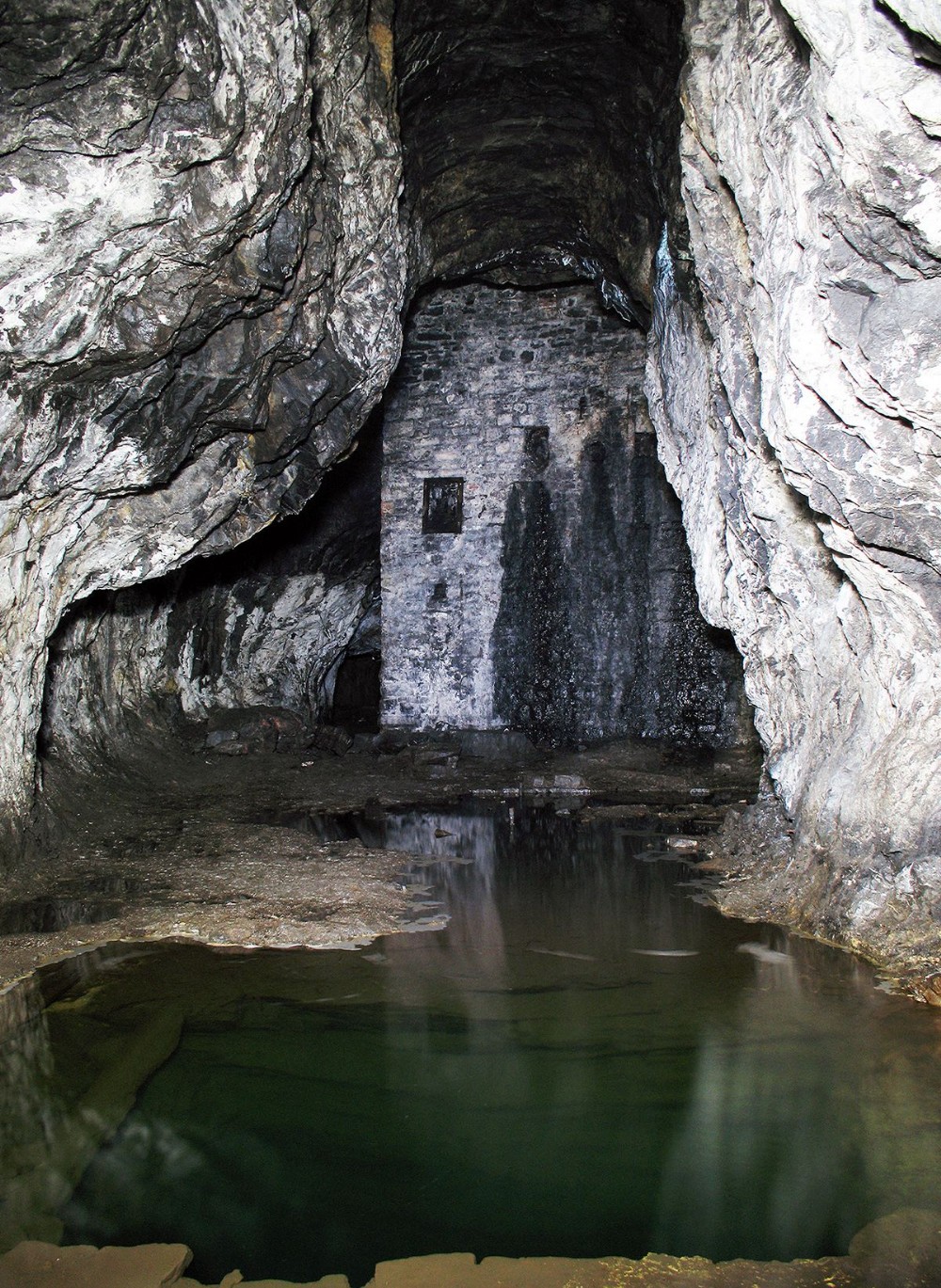 The shaft is about 1000' deep from this point. The chimney base with staining. The walls of the chamber were white (lime) washed to help increase light levels.