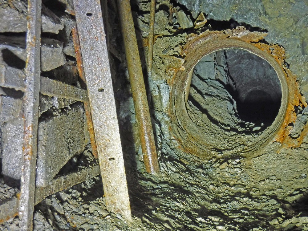 This was originally dug through in the 1970s by Simon Hughes and an oil drum fitted but had corroded over time. The level beyond was a tight crawl under bad roof. This was cleared in 2018 by RF and the bad roof supported by concrete. Two thirds of the drum representing the corroded area was cut out and steelwork put in to retain the material spilling in from Childs Shaft on the left going in as shown in the photograph.