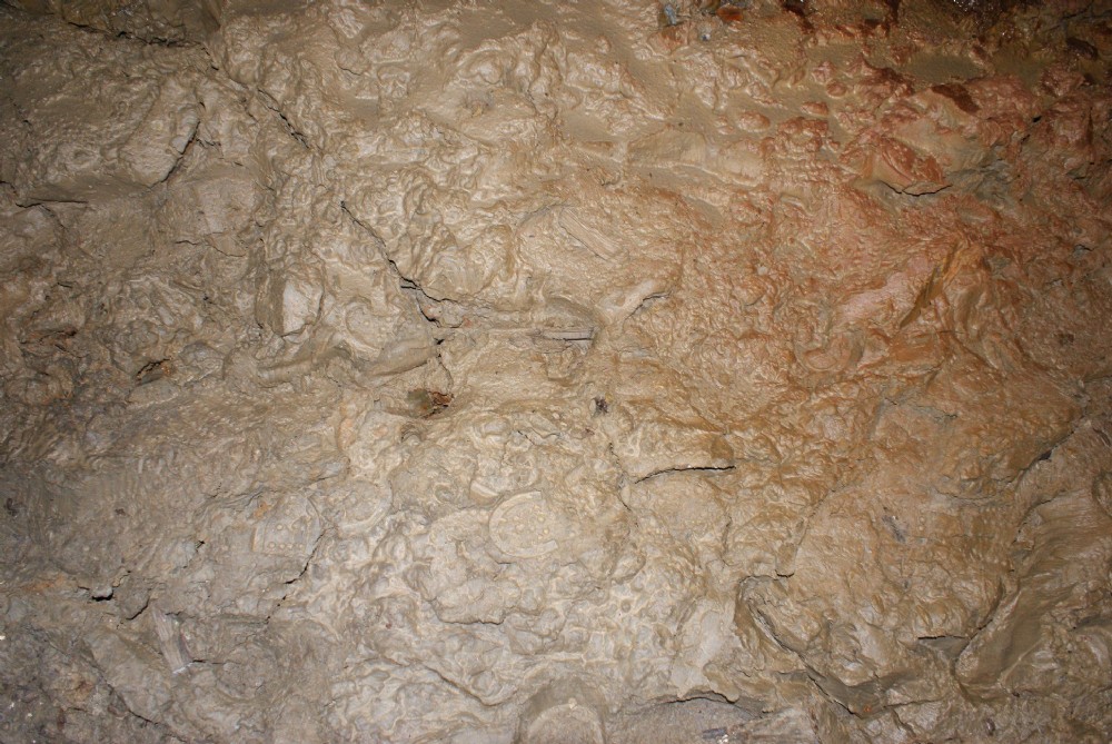 Numerous clog prints can be seen in a patch of soft mud.