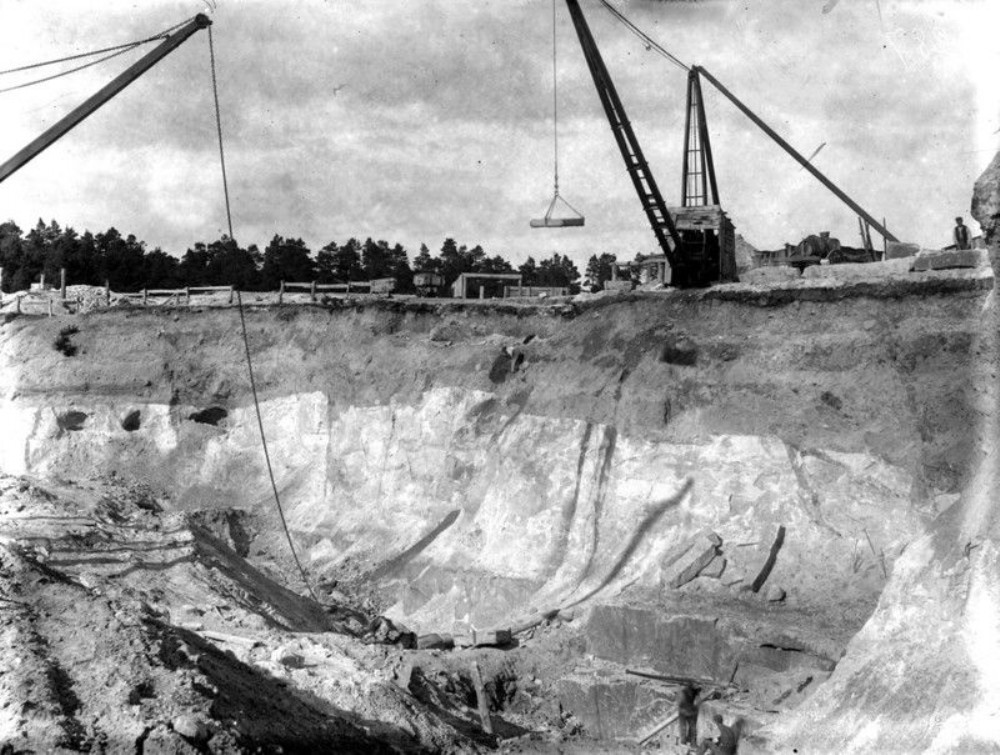 Clynelish Quarry, 1.3 km. west-north-west of Brora. Sutherland. Boulder clay, a glacial deposit resting on sands and fine-grained siliceous white sandstone (Clynestone). A manual winch-operated crane is on the left, a larger powered crane right of centre. The buildings on the extreme right could be the dressing sheds. The sandstones are of the Clynekirkton Sandstone Formation of Corallian (Upper Jurassic) age.