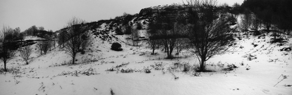 The quarry face is partially obscured behind the trees. On the quarry floor to the left of centre is an unburnt clamp with earthworks visible either side providing shelter to the clamps during roasting.