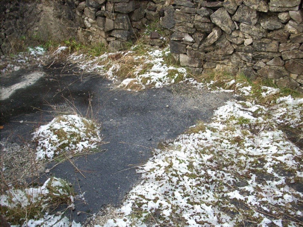 The floor of the coe comprises ashpalt to the left, slabs of limestone paving top right and smaller limestone cobbles bottom right