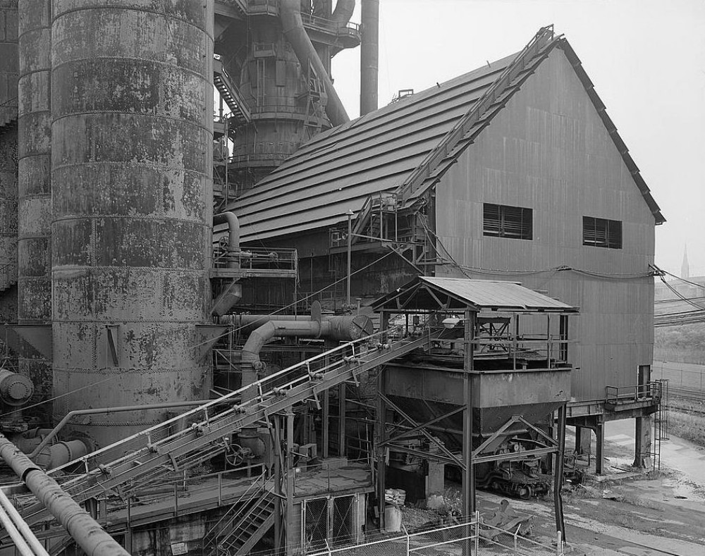 Coke 'fines' bin at Furnace D. After delivery to the trestle bins, the coke was screened and the coke 'fines' or breeze, were transported by conveyor to the coke fines bins where it was collected and leaded into dump trucks. The coke fines were then sold for fuel to a sinter plant in Lorain, Ohio