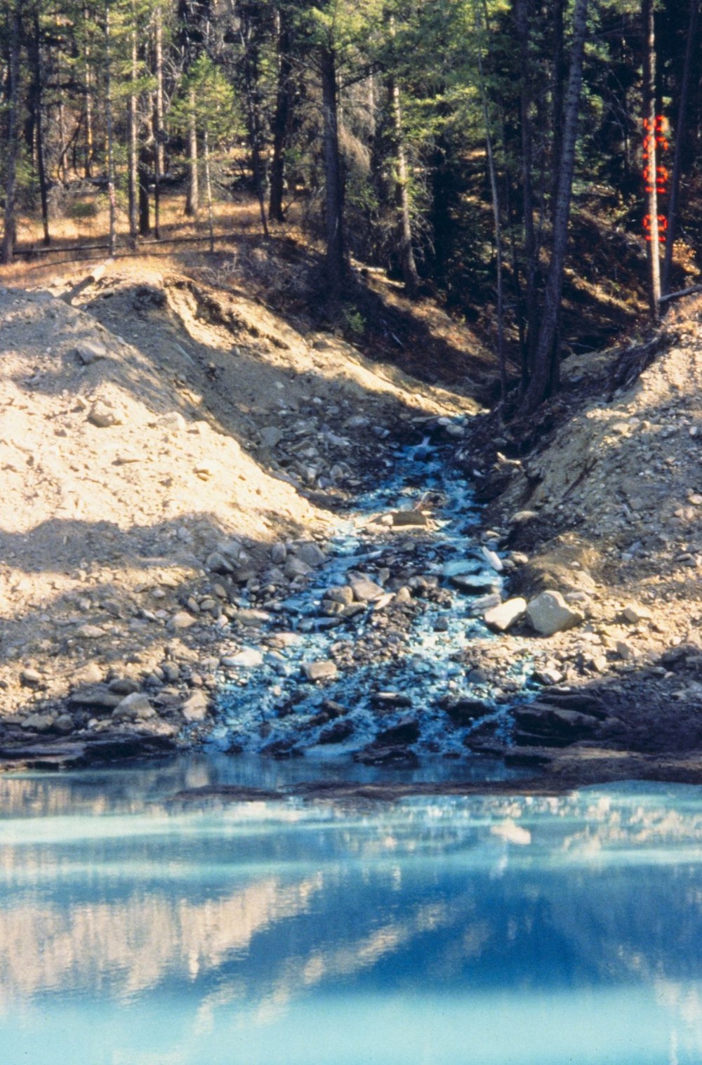 The distinct blue in this image is caused by copper contamination, Bucktail Creek. Nothing lives in this environment. This image shows a collection basin used as part of the remediation. Water is shunted to a treatment plant.
