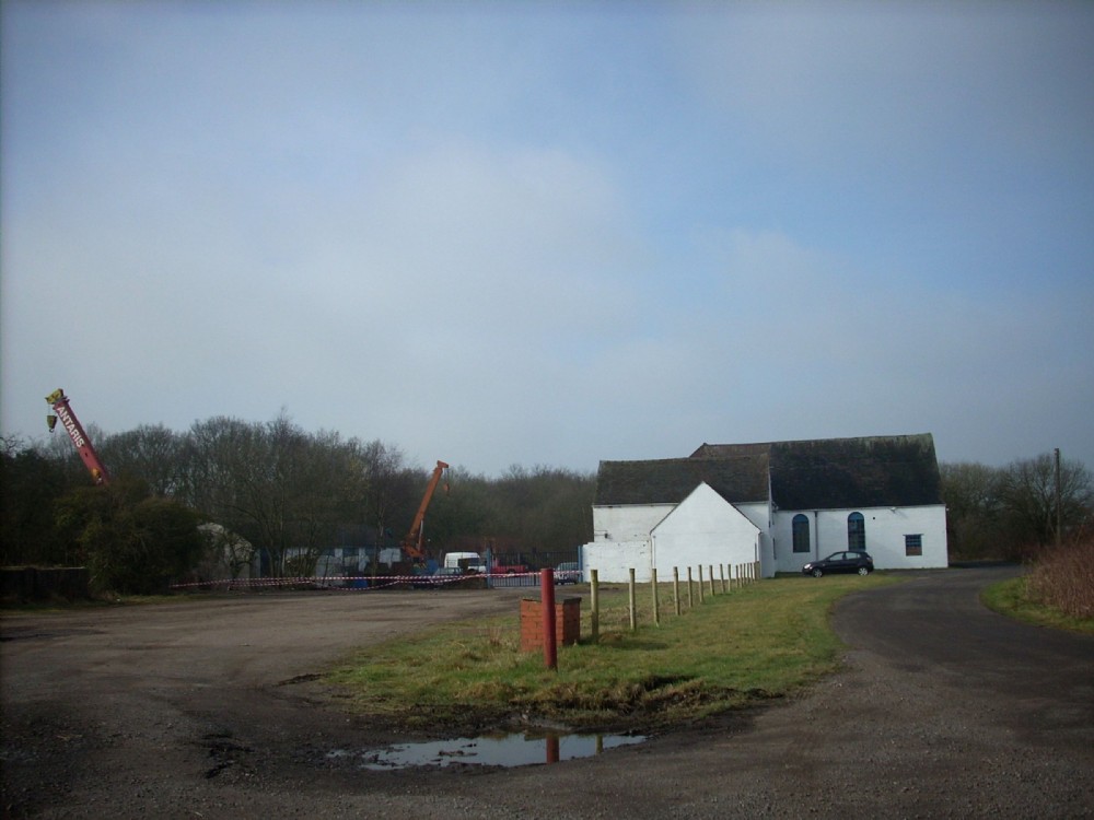 View looking towards the colliery site with the possible second building to the left. The shafts and spoil heap are behind the buildings (Mar 2011)
