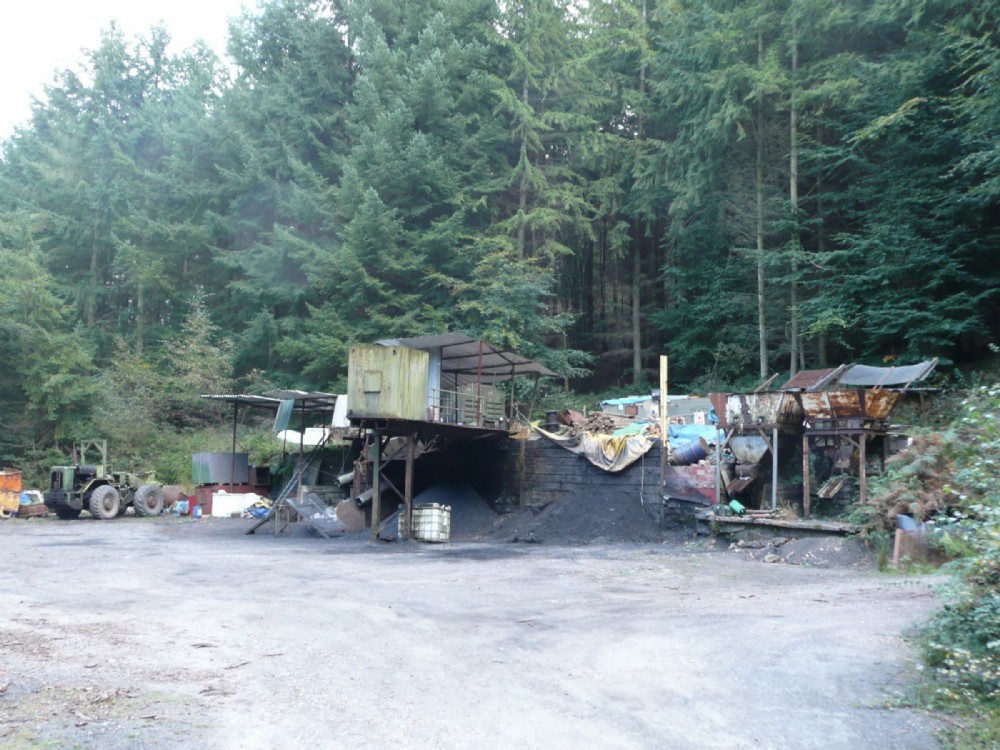General view of colliery yard. Rubber tyred shovel to left, tipping dock and grading plant centre. Drift is up on the bank behind the grading plant.