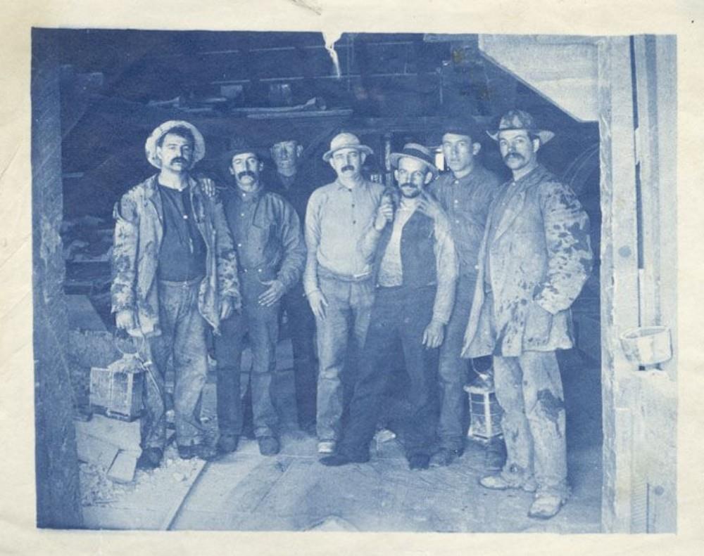Comstock miners, 1880s. Caption on original: "To Labor is to Pray."