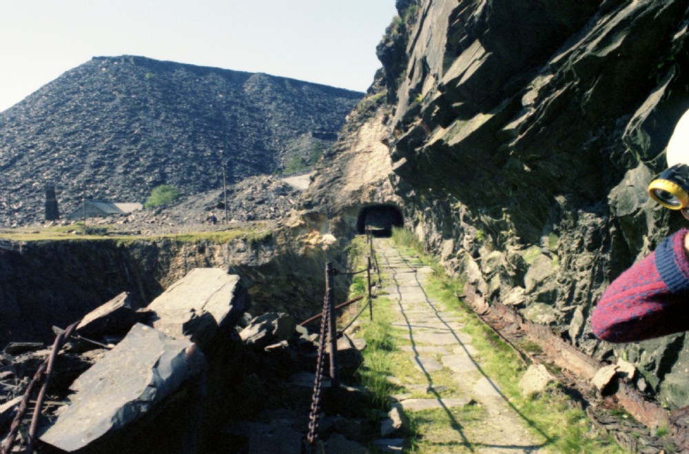 The part of the ledge near the Maenofferen Office had a handrail. The tunnel in the background was originally much longer. Old plans refer to this as "Old Lord Tunnel"
